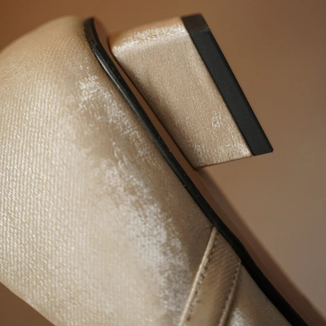 Hand-crafted with rich genuine suede and a shiny velvet finish, these short heels exude luxury in every detail. Featuring a softly padded insole for all day comfort, an adjustable strap, and a sturdy non-slip heel.